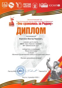 – ?Диплом лауреата I степени получил Десяткин Таман, ученик МБОУ «Терютская СОШ им. Г.А.Кривошапкина».