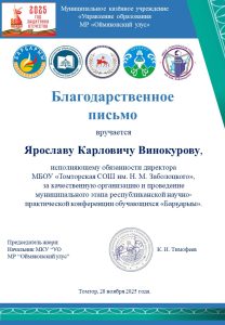 Благодарственное письмо за подготовку дипломантов (призеров и победителей)