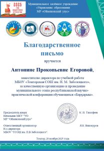 Благодарственное письмо за подготовку дипломантов (призеров и победителей)